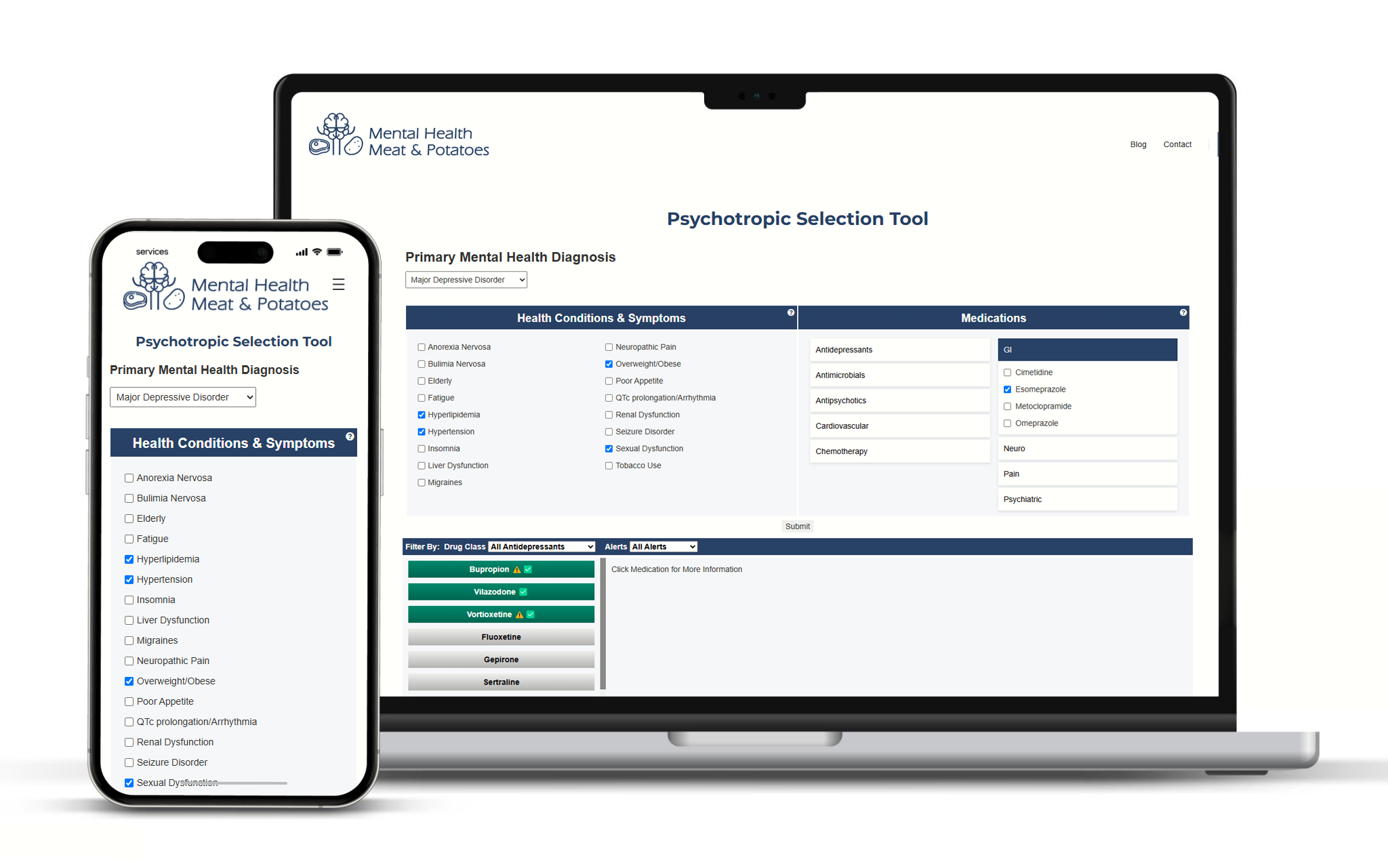 The Psychotropic Selection Tool builds on what made the Antidepressant Selection Tool helpful, expanding to include antipsychotics, mood stabilizers, and more. Compare medication risks and benefits across conditions like major depressive disorder, bipolar disorder, and schizophrenia.